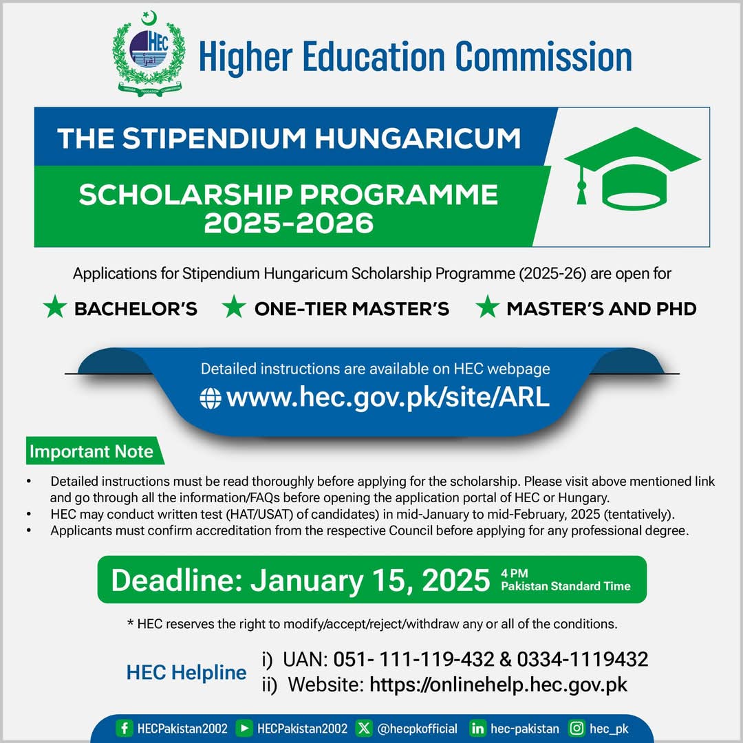 Are you dreaming of studying abroad? The Higher Education Commission (HEC) of Pakistan is inviting applications for the prestigious Stipendium Hungaricum Scholarship Programme for the academic year 2025-2026. This scholarship offers a fantastic opportunity for Pakistani students to pursue Bachelor’s, One-Tier Master’s, Master’s, and PhD degrees in Hungary. Here’s everything you need to know to apply.