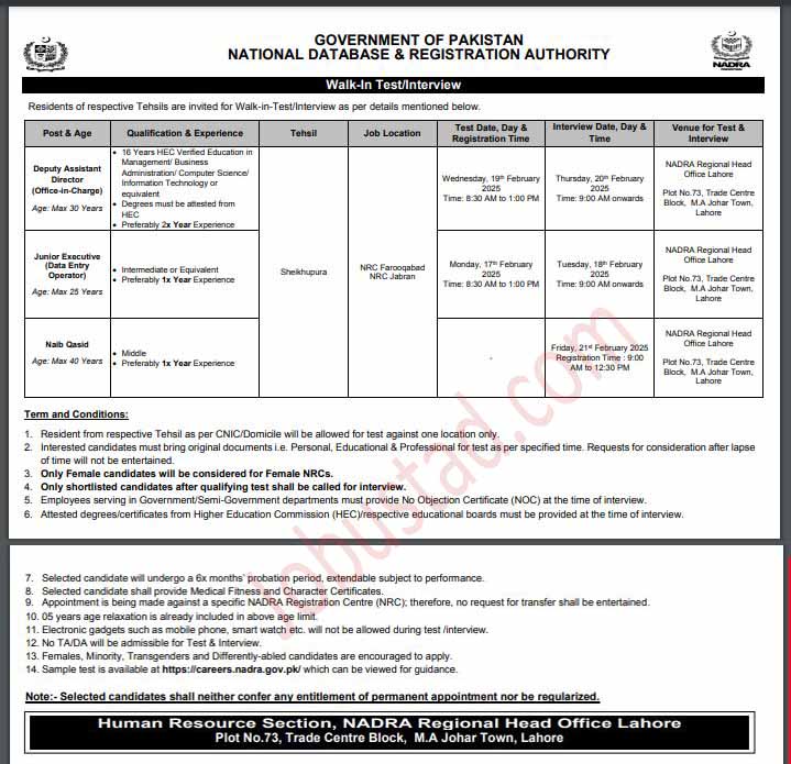 The National Database and Registration Authority (NADRA) of Pakistan has announced a series of job opportunities in the Lahore region, inviting residents to participate in walk-in interviews and tests. This initiative aims to fill various positions within NADRA, offering a chance for qualified individuals to contribute to one of Pakistan’s most critical governmental organizations. The positions available include Deputy Assistant Director (Office-in-Charge), Junior Executive (Data Entry Operator), and Naib Qasid. Below is a detailed overview of the opportunities, requirements, and application process.