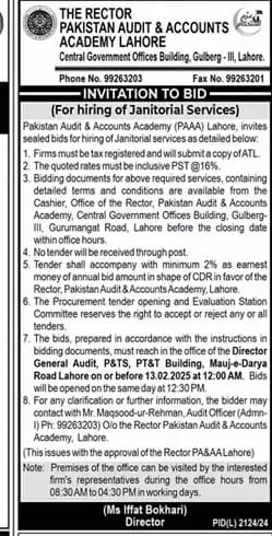 Pakistan Audit & Accounts Academy Invites Bids for Janitorial Services Read More