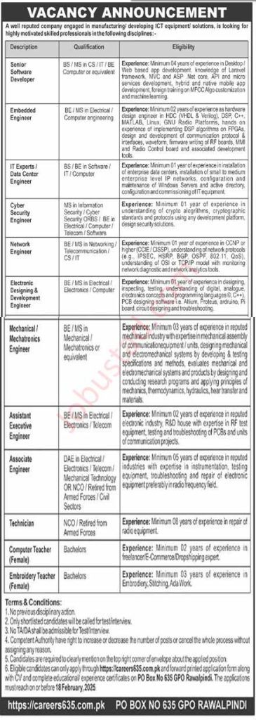 A well-reputed public sector organization in Rawalpindi, engaged in the manufacturing and development of ICT (Information and Communication Technology) equipment solutions, has announced a range of job opportunities for highly motivated and skilled professionals. This recruitment drive aims to fill various positions across multiple disciplines, offering a chance for qualified individuals to contribute to cutting-edge projects in the ICT sector. Below is a detailed overview of the available positions, qualifications, and application process. other jobs